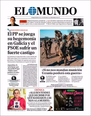EL MUNDO: "El PP se juega su hegemonía en Galicia y el PSOE sufrir un fuerte castigo"; "Argentina, la 'provincia' que encarriló Fraga: "Sabía cómo pedirte el voto"; "Si no nos mandan munición Ucrania perderá esta guerra"; "Alguien tendrá que decirme por qué mandaron a mi hijo a la muerte".