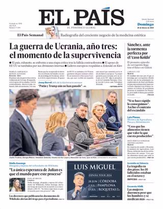 EL PAÍS: "La guerra de Ucrania, año tres: el momento de la supervivencia"; "Sánchez, ante la tormenta perfecta por el 'caso Koldo'"; "'Si se hace rápido lo conseguimos'. Así fue el contrato del escándalo"; "'La única esperanza de Julian es que el mundo pare este proceso'"; "La tragedia en dos pisos: los 10 fallecidos estaban en el octavo y noveno"; "Las mujeres duermen peor que los hombres y se medican más".