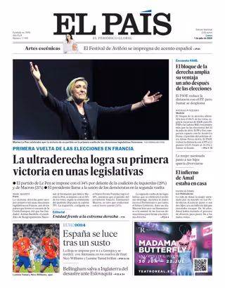 EL MUNDO: "La extrema derecha barre a Macron y sobresalta a Europa"; "España vibra, supera a la correosa Georgia y desafía a Alemania"; "Los 5 indicios que acorralan al fiscal general en el caso del novio de Ayuso"; "El 68% de los españoles, en contra de la 'financiación singular' para Cataluña"; "La reducción de la jornada laboral de Díaz costará 12.000 millones a las empresas"; "Los mayores enseñan a los pequeños: la fórmula mágica de un instituto con alumnos de 15 países".