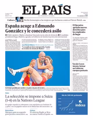EL PAÍS: "España acoge a Edmundo González y le concederá asilo"; "La selección se impone a Suiza (1-4) en la Nations League"; "El Ejecutivo aprueba nuevos derechos para las empleadas de hogar"; "Von der Leyen intenta formar un Gobierno europeo paritario".