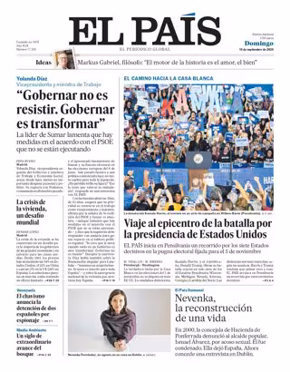 EL PAÍS: "Viaje al epicentro de la batalla por la presidencia de Estados Unidos"; "Entrevista a Yolanda Díaz: 'Gobernar no es resistir. Gobernar es transformar'"; "La crisis de la vivienda, un desafío mundial"; "El chavismo anuncia la detención de dos españoles por espionaje"; "Un siglo de extraordinario avance del bosque".