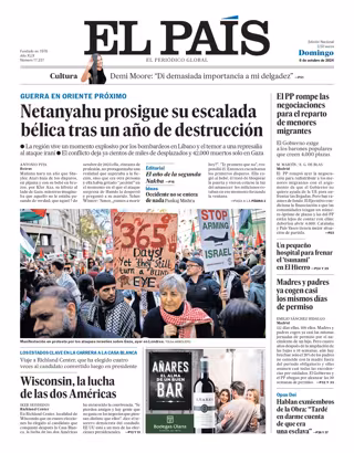 EL PAÍS: "Netanyahu prosigue su escalada bélica tras un año de destrucción"; "Wisconsin, la lucha de las dos Américas"; "El PP rompe las negociaciones para el reparto de menores migrantes"; "Madres y padres ya cogen casi los mismos días de permiso".