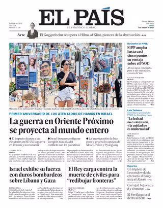 EL PAÍS: "La guerra en Oriente Próximo se proyecta al mundo entero"; "Israel exhibe su fuerza con duros bombardeos sobre Líbano y Gaza"; "El Rey carga contra la muerte de civiles para "redibujar fronteras"; "El PP amplía hasta casi cinco puntos su ventaja sobre el PSOE"; "Entrevista a Luis Tudanca, secretario general del PSOE de Castilla y León: '"La lealtad no es sumisión, y la unidad no es uniformidad'".