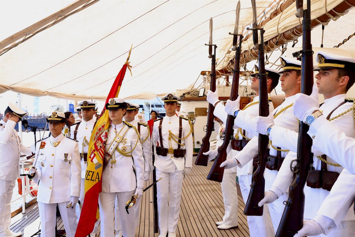 Esta es la primera vez que la Princesa Leonor ejerce de abanderada en un acto de este tipo. El lugar elegido ha sido precisamente el mismo en el que su padre, el Rey Felipe VI, también fue el abanderado durante su crucero de instrucción a bordo del buque escuela el 19 de marzo de 1987.