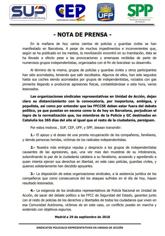 No obstante, los principales sindicatos de Policía Nacional del país también han querido condenar "las provocaciones y amenazas" recibidas por parte de grupos independentistas "organizados con el fin de boicotear el desarrollo" de la manifestación de este sábado.