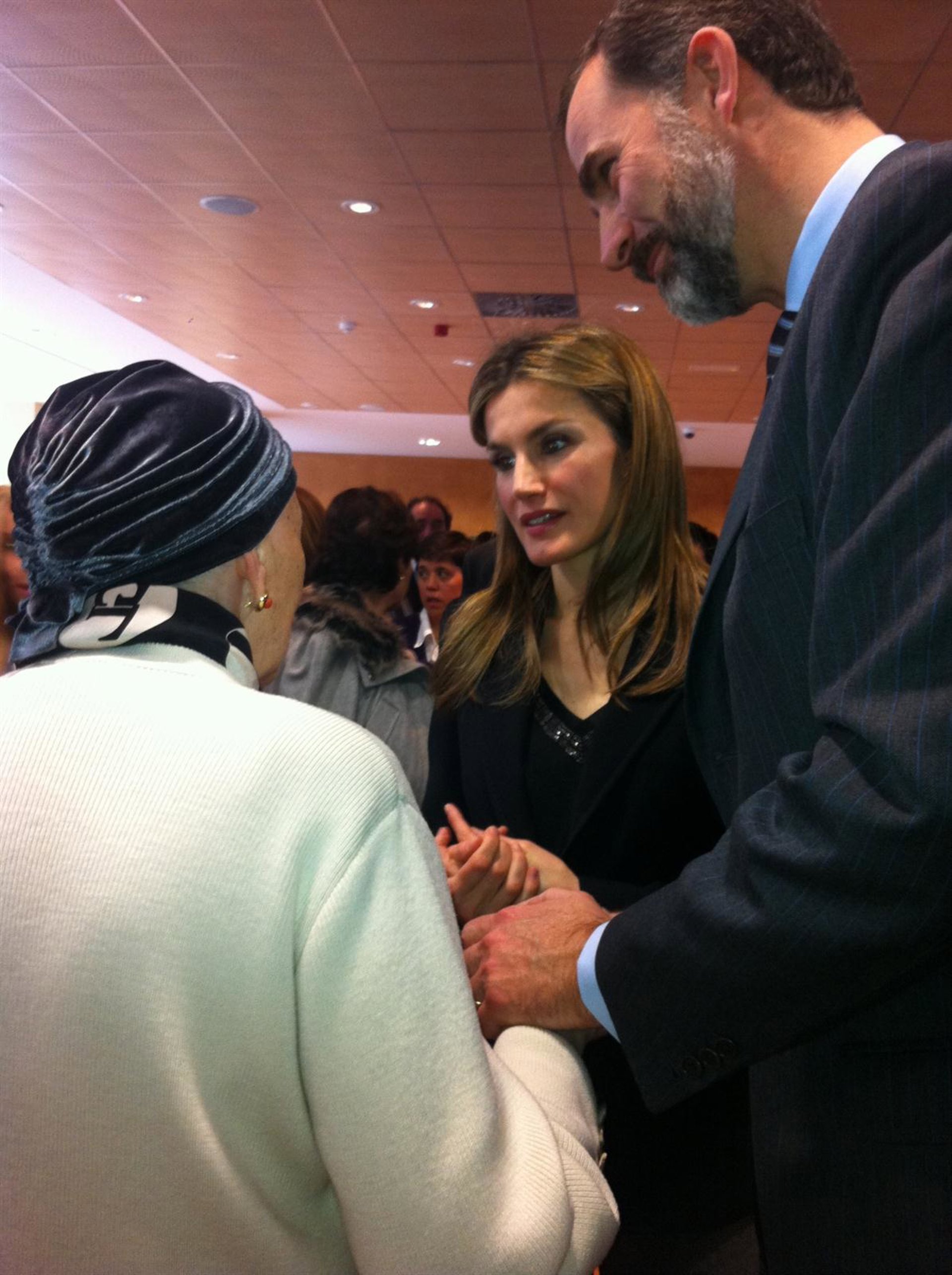 Los Príncipes han hecho un recorrido por las instalaciones y han conversado con los residentes del equipamiento. Amelia Figueras Sendón le ha entregado a la Princesa Letizia unos broches con las iniciales de las infantas Sofía y Leonor, que elaboró en un taller de la residencia.