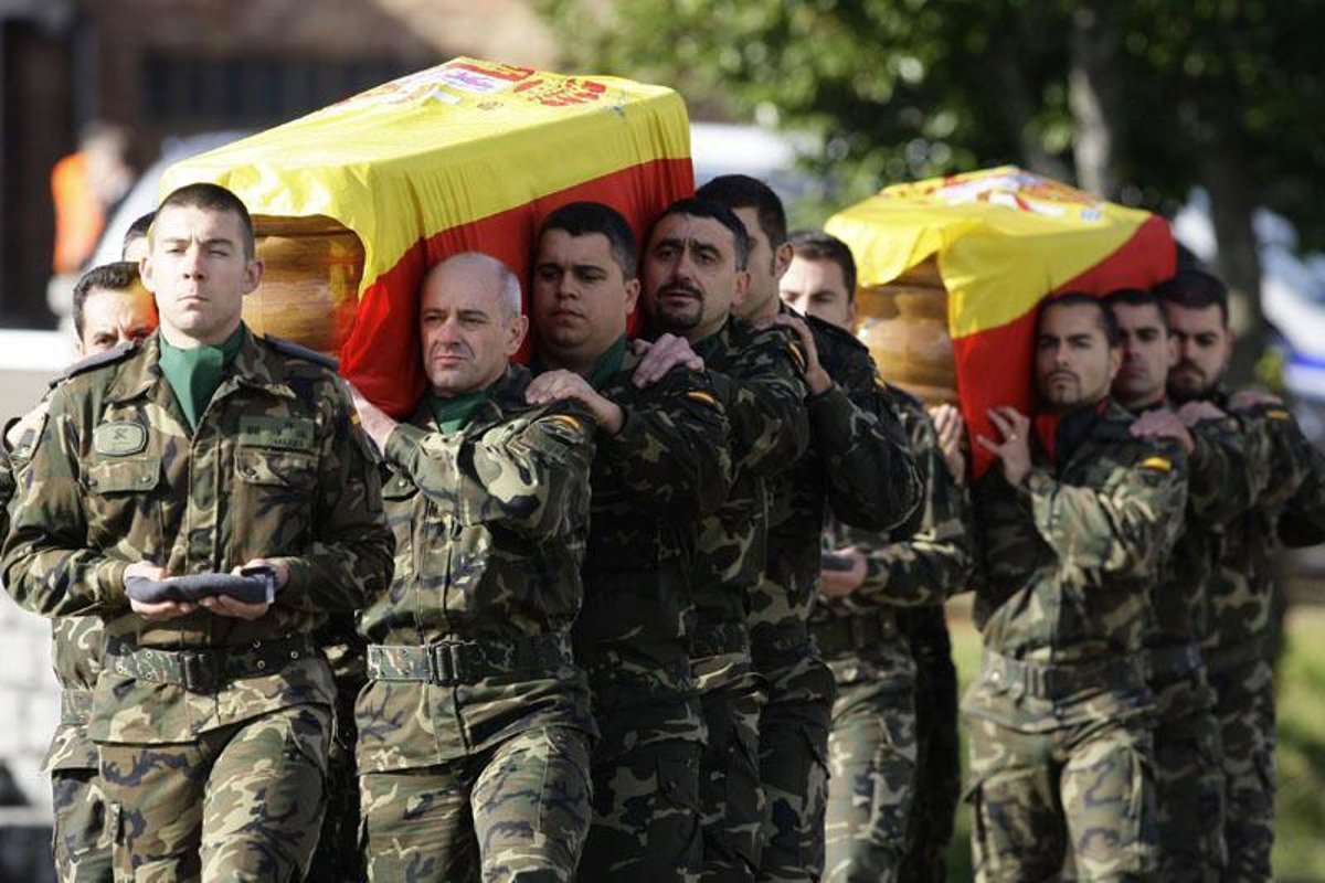 El momento más emotivo del funeral, en el que los familiares de los fallecidos no pudieron reprimir el llanto, se produjo cuando los compañeros de las víctimas retiraron los féretros, tras el homenaje rendido por los guiones y banderines a los que dieron la vida por España, con la colocación de una corona de flores rojas ante los ataúdes y la interpretación del Himno nacional.