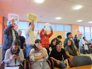 Durante sus protestas, los afectados por las hipotecas interrumpieron en varias ocasiones las intervenciones de los concejales, especialmente durante el debate de una moción sobre el estado de los viales del municipio, recriminando a los políticos que hablasen de "aceras" y no de los problemas de las personas desahuciadas. Por su parte, los trabajadores del IMD, reclamaban su readmisión.