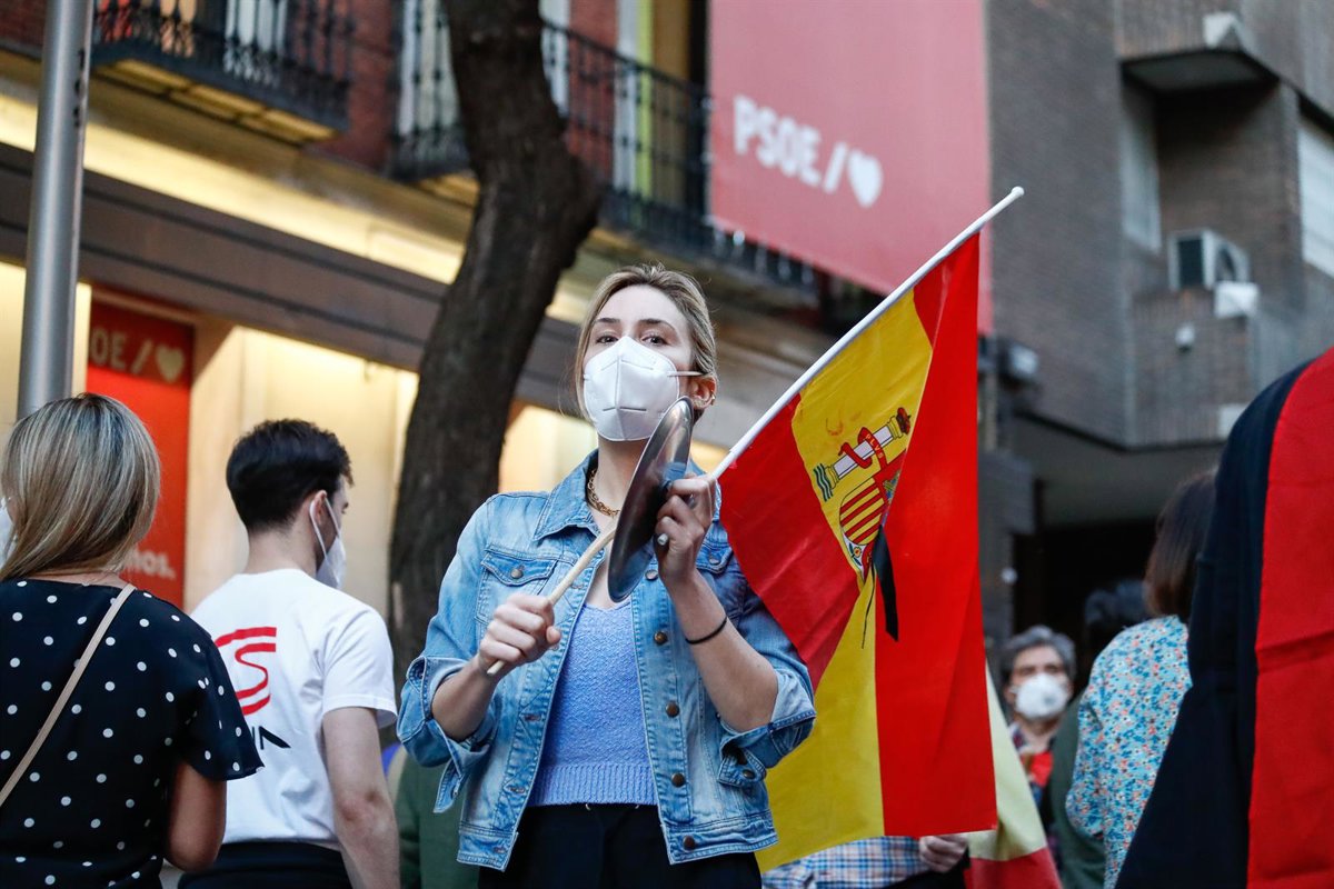 Una mujer con mascarilla sostiene una bandera de España mientras golpea una cacerola en señal de protesta durante la manifestación celebrada en la puerta de la sede del PSOE de la calle Ferraz de Madrid. - Oscar J. Barroso / AFP7 / Europa Press