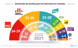 El PSC y ERC repetirían el empate técnico en las elecciones en Cataluña si se celebraran ahora, ya que los socialistas obtendrían entre 34 y 39 escaños, y ERC entre 33 y 38, mientras que Junts quedaría en tercera posición con entre 23 y 28 diputados, según una encuesta del Centre d'Estudis d'Opinió (CEO) de la Generalitat.