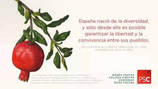 Este mensaje, recogido por Europa Press, aparece acompañado con un dibujo de una granada, una fruta cuyos beneficios elogia el PSC en su 'christmas'. "La granada es una fruta con propiedades medicinales y terapéuticas incomparables a otros alimentos. Sus efectos van desde la reducción de enfermedades cardiovasculares e infecciones bacterianas hasta la mejora de la memoria y el rendimiento físico", afirma la felicitación navideña, que aparece acompañada con las siglas del PSC y un mensaje de 'Felices Fiestas' en castellano y las tres lenguas cooficiales.