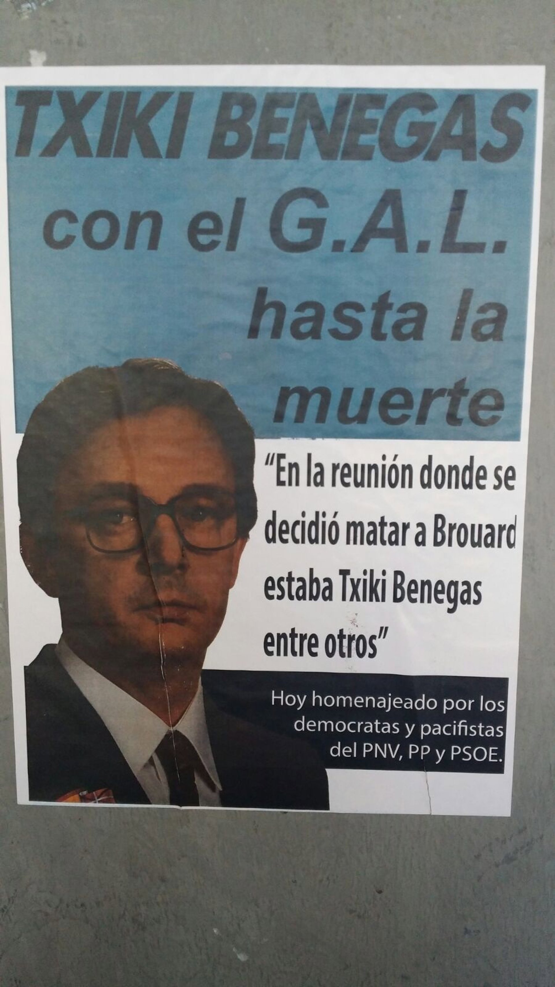 En un comunicado, los socialistas guipuzcoanos han condenado la colocación de estos carteles en los que, sobre la fotografía de 'Txiki' Benegas, se puede leer 'Txiki Benegas con el GAL hasta la muerte. En la reunión donde se decidió matar a Brouard estaba Txiki Benegas entre otros. Hoy homenajeado por los demócratas y pacifistas de PNV, PP y PSOE'.