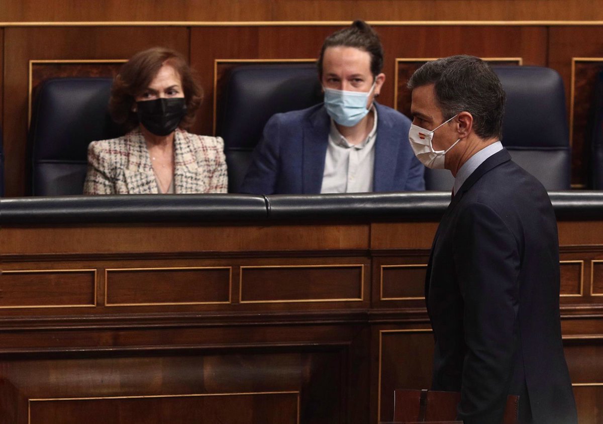 El presidente del Gobierno, Pedro Sánchez, pasa por delante de los vicepresidentes Carmen Calvo y Pablo Iglesias - EUROPA PRESS/E. Parra. POOL - Europa Press