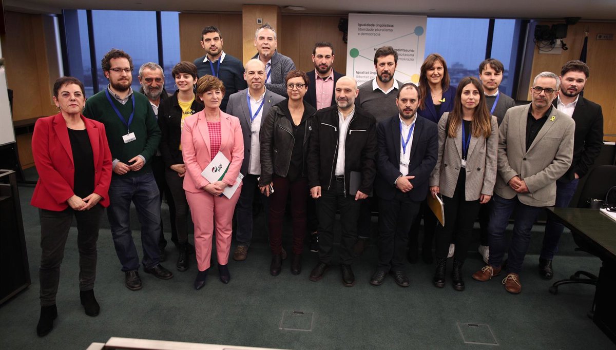Foto de los participantes en la reunión sobre Igualdad Lingüística, entre los que se encuentran representantes de entidades sociales en defensa del aragonés, asturiano, catalán y euskera además de diputados de ERC; EHBildu; JxCAT; BNG y Galicia en Común. - Eduardo Parra - Europa Press