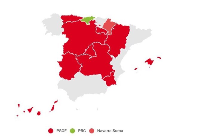 La encuesta apunta a que los socialistas volverían a gobernar siempre que cierren pactos en Aragón, Asturias, Extremadura, Baleares y Castilla-La Mancha. En Canarias tendrán que pactar con Coalición Canaria, que ha quedado segunda fuerza y a distancia del PSOE.