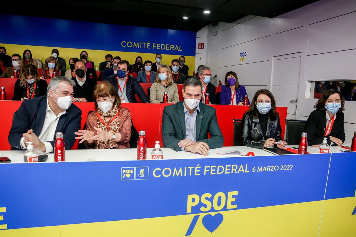El secretario de organización, Santos Cerdán León, la presidenta del Comité, Cristina Narbona, el presidente del Gobierno y secretario general del PSOE, Pedro Sánchez, y la vicesecretaria general, Adriana Lastra Fernández, en el Comité Federal del PSOE - Ricardo Rubio - Europa Press
