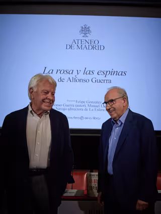 El expresidente del Gobierno, Felipe González (i), y el exvicepresidente del Gobierno, Alfonso Guerra (d), durante la presentación de su nueva obra 'La rosa y las espinas'. - Jesús Hellín - Europa Press