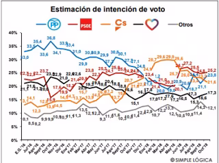 El Índice de Opinión Pública de octubre refleja que el PSOE se mantiene como el partido con mayor respaldo electoral desde que ganó la moción de censura el pasado mes de junio en el Parlamento contra Mariano Rajoy. En octubre se sitúa con el 25,2 por ciento de la intención de voto, mejorando en 0,4 puntos sobre su resultado del sondeo de Simple Lógica de septiembre, cuando otorgaba al partido de Pedro Sánchez el 24,8 por ciento de los apoyos.