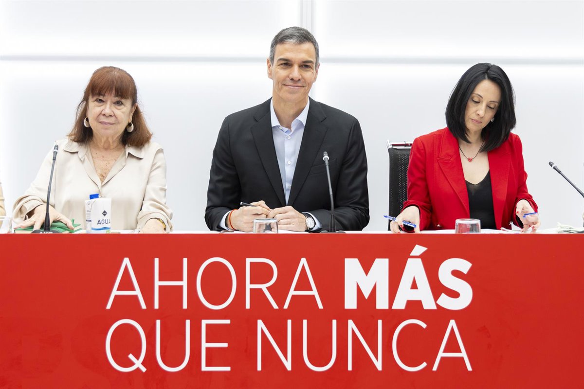 El presidene del Gobierno y secretario general del PSOE, Pedro Sánchez, junto a la presidenta del partido, Cristina Narbona y la secretaria de Organización, Rebeca Torró, en la reunión de la Ejecutiva Federal.
