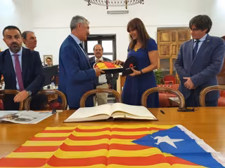 También ha firmado el libro de honor del consistorio y ha agradecido la visita obsequiando una réplica hecha a mano de la bandera del Parlament de Cataluña.