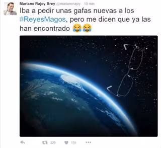 La imagen va acompañada de un comentario en el que el jefe del Ejecutivo señala que "iba a pedir unas gafas nuevas a los Reyes Magos", después de que las suyas se rompieran tras el altercado sufrido en su tierra natal. "Pero (Sus Majestades) me dicen que ya las han encontrado", apunta.