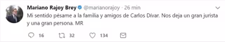 "Mi sentido pésame a la familia y amigos de Carlos Dívar. Nos deja un gran jurista y una gran persona", ha escrito el jefe del Ejecutivo en un mensaje en su cuenta personal de esta red social.