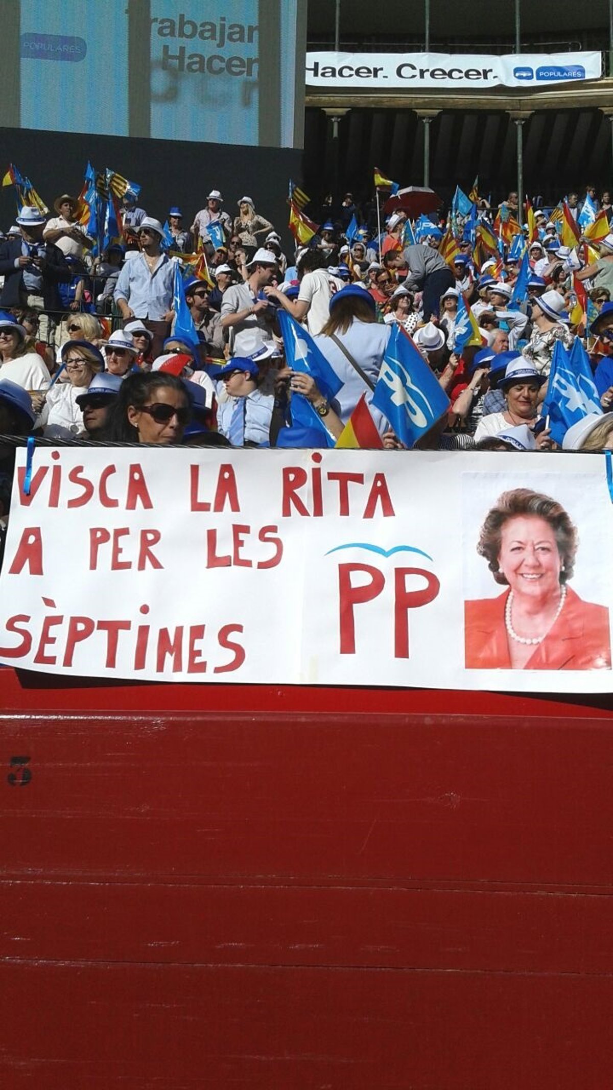 "Visca la Rita. A per la septima", se leía en uno de los carteles situados en la grada, donde también los organizadores han colocado pancartas con el lema de campaña del PP en estos comicios "Trabajar. Hacer. Crecer". Las casi tres horas de espera han estado amenizadas por música española.