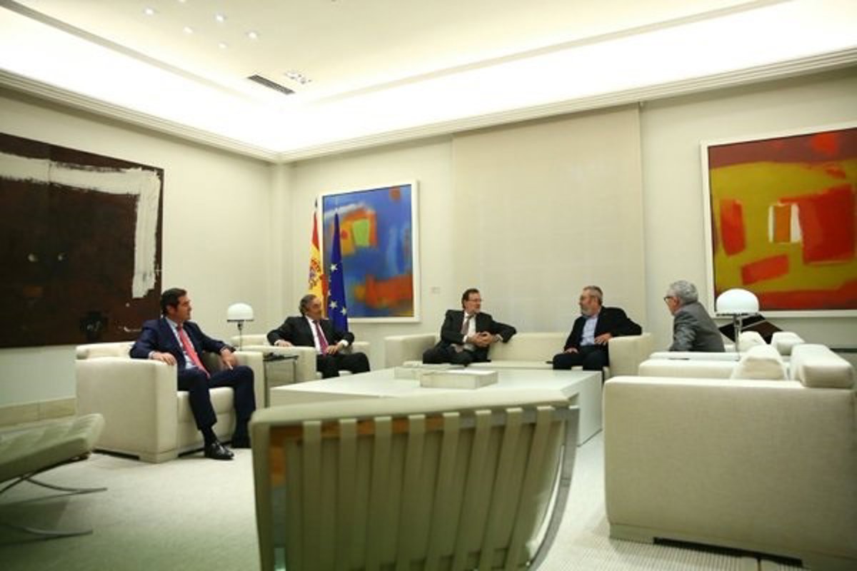 Los secretarios generales de CC.OO. y UGT, Ignacio Fernández Toxo y Cándido Méndez, se han reunido este miércoles durante hora y media con el presidente del Gobierno, dentro de la ronda de contactos con dirigentes políticos y sociales sobre el conflicto catalán. Al encuentro también han asistido el presidente de CEOE, Juan Rosell, y el de Cepyme, Antonio Garamendi.