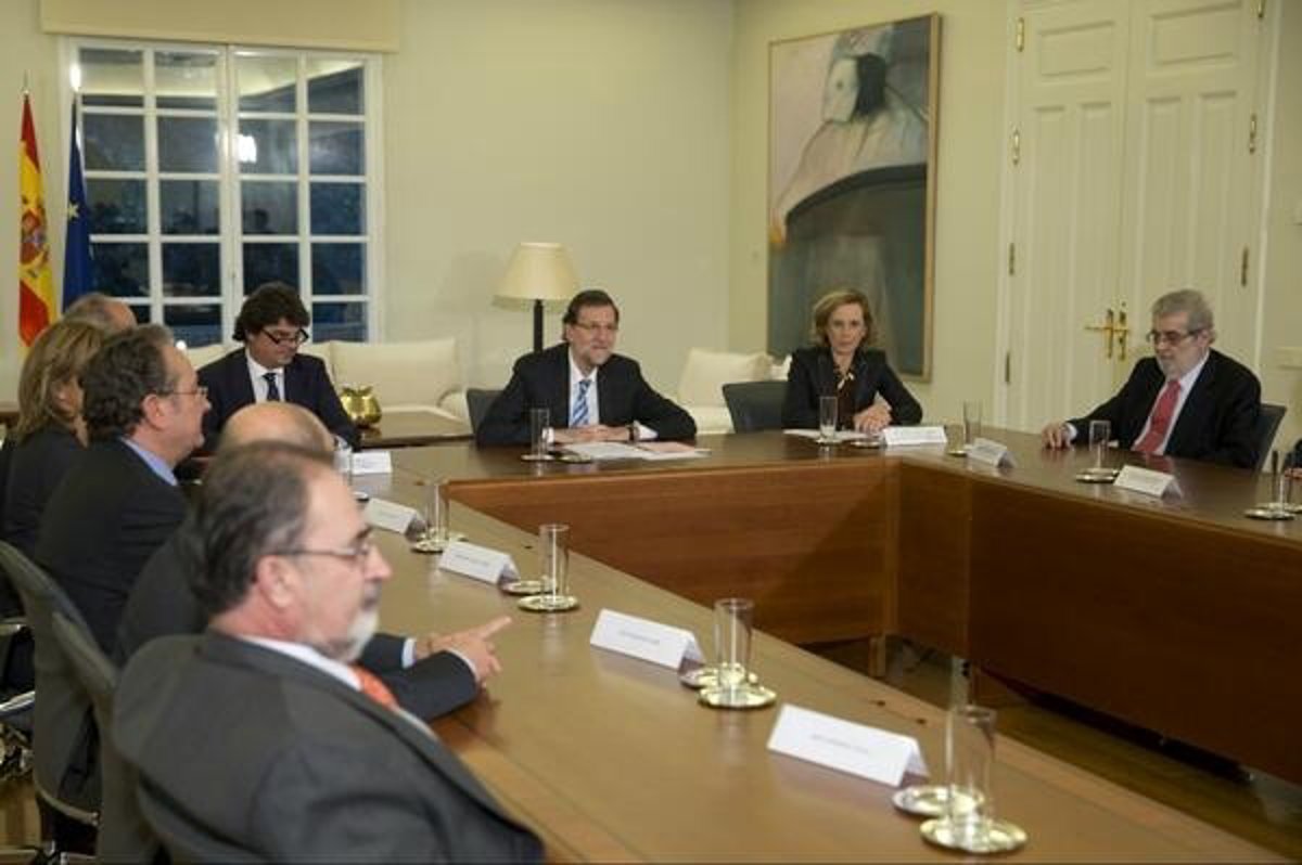 El presidente del Gobierno, Mariano Rajoy, ha recibido este miércoles en el Palacio de La Moncloa a representantes del mundo editorial, con quienes ha abordado cuestiones relacionadas con la situación que vive actualmente el sector.