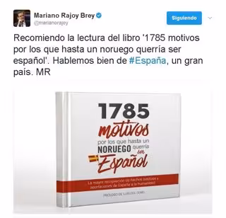 Rajoy, que se encuentra en París en una cumbre con líderes europeos, firma personalmente este mensaje en la citada red social, en el que no menciona la polémica sobre el espacio televisivo. El presidente adjunta una foto del libro en cuestión para ilustrar su mensaje: "Recomiendo la lectura del libro '1785 motivos por los que hasta un noruego querría ser español'. Hablemos bien de #España, un gran país".