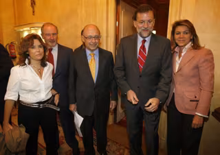 Rajoy hizo estas declaraciones en la presentación de la conferencia en el Foro Nueva Economía del coordinador de Economía del PP, Cristóbal Montoro, un acto al que acudieron también el ex vicepresidente económico y ex director del FMI, Rodrigo Rato, la secretaria general del PP, María Dolores de Cospedal, y la portavoz del Grupo Popular, Soraya Sáenz de Santamaría. Todos ellos posaron juntos ante los gráficos antes de que comenzara el acto.