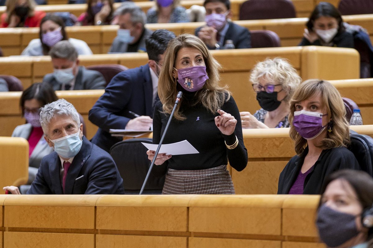 La ministra de Transportes, Movilidad y Agenda Urbana, Raquel Sánchez, interviene en una sesión de control al Gobierno en el Senado, a 8 de marzo de 2022, en Madrid (España). La guerra en Ucrania y sus derivadas económicas acaparan este pleno en el que - A. Pérez Meca - Europa Press