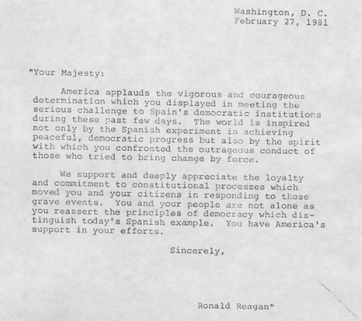 Así, el 10 de marzo Juan Carlos I agradece por carta "los elogiosos términos" en los que Reagan se refiere a las instituciones españolas: "Es alentador para el pueblo español saber que, en sus esfuerzos, tiene a su lado a la gran nación americana".