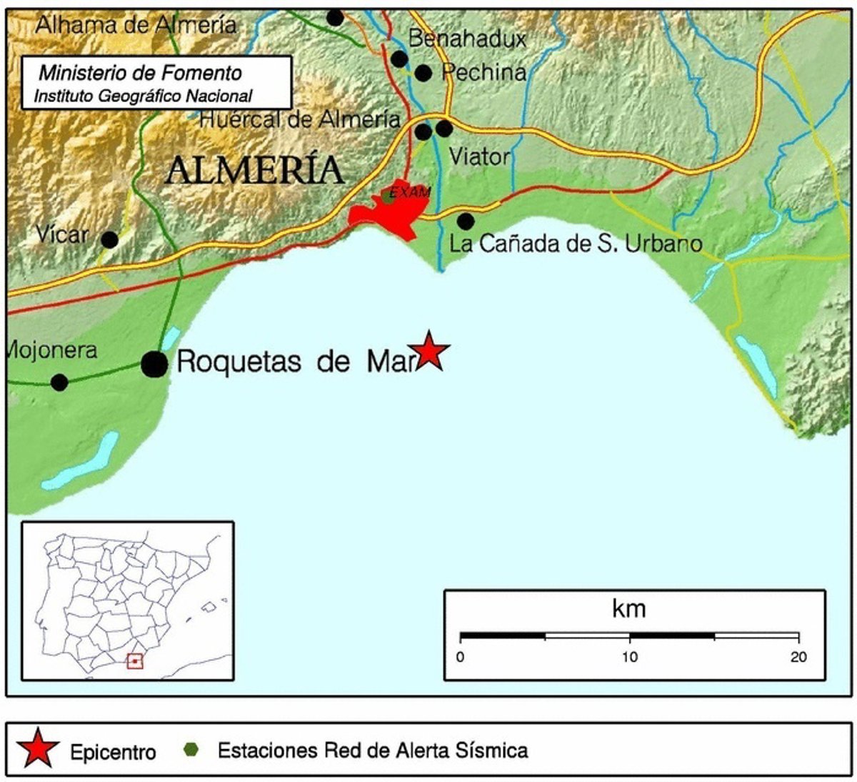 El movimiento telúrico se ha manifestado como una "fuerte sacudida aunque breve" que no ha causado daños materiales y el epicentro está localizado a 36.7703 de latitud y -2.4331 de longitud, en el mar y frente a la barriada capitalina de La Cañada.
