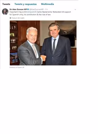 Duncan ha señalado que ha mantenido un "importante encuentro" con el embajador. Su mensaje lo ha retuiteado el embajador británico en España, Simon Manley, reafirmando: "Apoyamos la unidad de España, su Constitución y el Estado de Derecho".