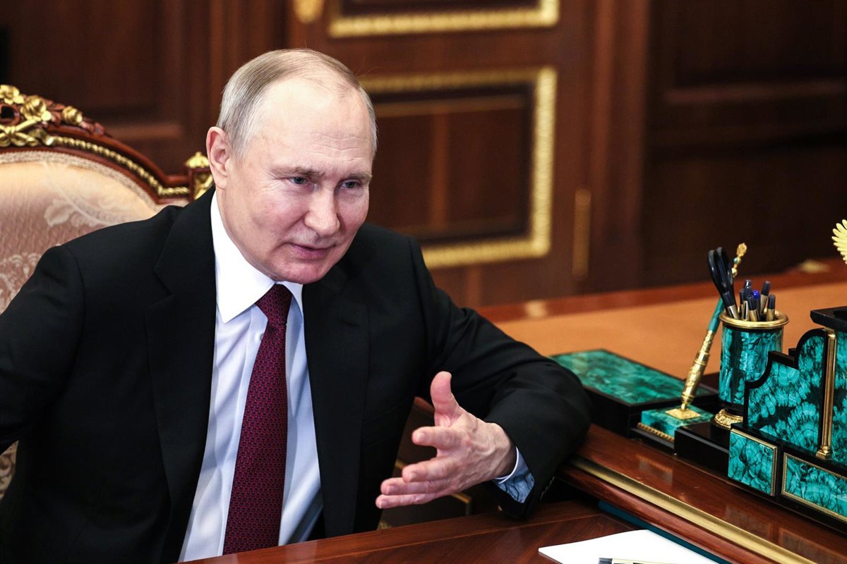 HANDOUT - 12 April 2023, Russia, Moscow: Russian President Vladimir Putin speaks with Director General of Roscosmos Yury Borisov (not pictured). Putin has described a planned Russian space station as a necessary step toward realizing ambitions for a nat - -/Kremlin/Dpa