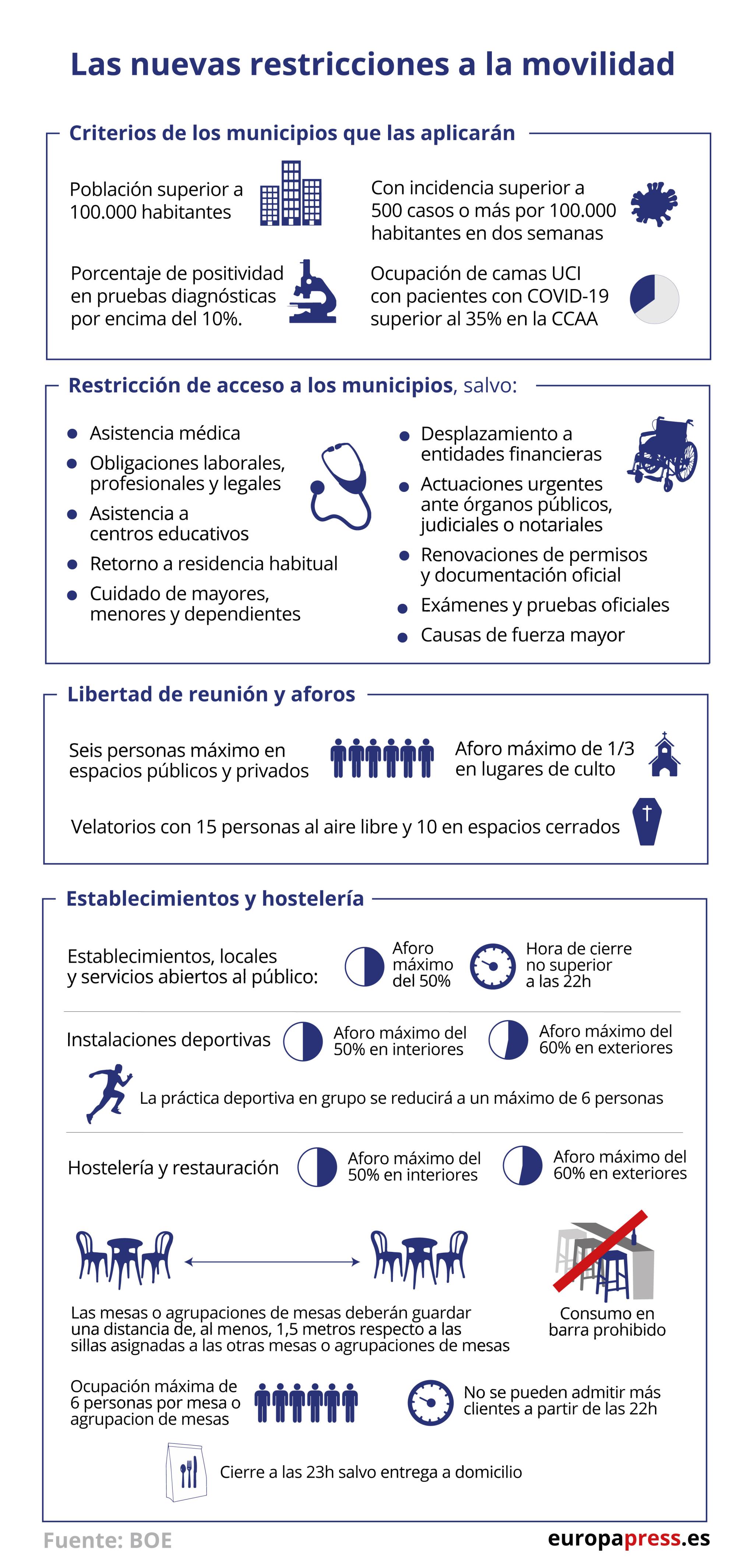 Las medidas entraron en vigor en la medianoche del 13 de octubre y se aplicarán durante 14 días. A estas nuevas normas hay que añadir el cierre perimetral de toda la comunidad autónoma, que se impondrá desde el 22 de octubre al 4 de noviembre.