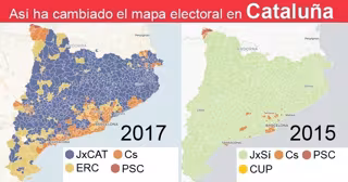 En 2015, la marca de Junts pel Sí ganó en 908 municipios, mientras que este año el conjunto de Junts per Catalunya y ERC ha sido primera fuerza en 102 municipios menos: 806, siendo la lista encabezada por Carles Puigdemont la que ha ganado en más localidades: 664, frente a 142 de ERC.