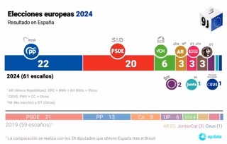 El PP ganó las elecciones europeas celebradas este domingo con el 34,2% de los votos, cuatro puntos más que el PSOE, que aguantó en el 30,1%. Vox, que se consolidó como tercera fuerza, sumó con el PP 5,7 puntos más que PSOE, Sumar y Podemos. Alvise Pérez dio la sorpresa como sexta fuerza, pisando los talones a Sumar que sufrió un descenso respecto a comicios anteriores, en contraste con el resurgir de Podemos.
