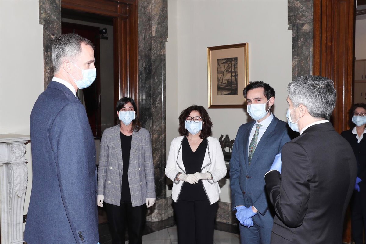 El secretario de Estado de Seguridad, Rafael Pérez (2d); el Rey Felipe VI (1i), el ministro del Interior, Fernando Grande-Marlaska (1d); y la subsecretaría del Interior, Isabel Goicoechea (3i), minutos antes de una reunión por videoconferencia con el Ce - Casa de S.M. el Rey