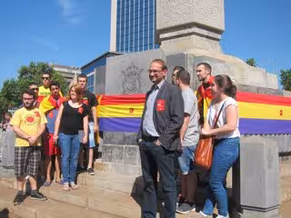 Las juventudes de ICV Joves d'Esquerra Verda (JEV) han vestido este jueves el monolito de la plaza barcelonesa Juan Carlos I con una bandera republicana, en un acto para reclamar un referéndum sobre la continuidad de la Monarquía en el que también ha participado el colíder ecosocialista, Joan Herrera.