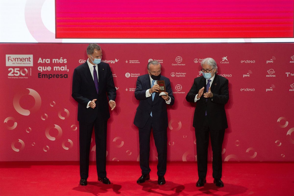 Tras entregar las Medallas de Honor del 250 aniversario de Foment al presidente de la Fundació Bancària la Caixa y presidente del Consejo de Administración de CriteriaCaixa, Isidre Fainé, y a la Asociación Industrial Textil del Proceso Algodonero (Aitpa), el Rey ha ensalzado a los dos premiados.