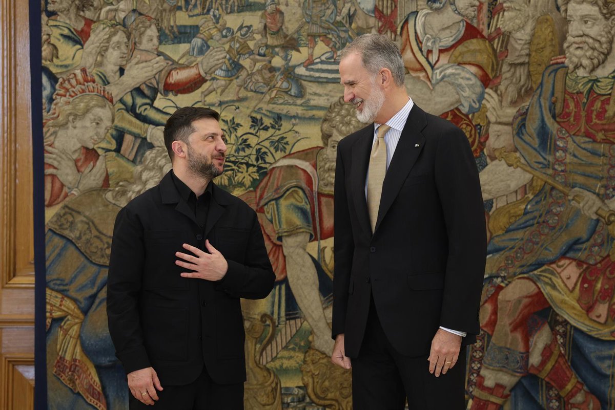 El Rey Felipe VI ha recibido este miércoles en el Palacio de la Zarzuela al presidente de Ucrania, Volodimir Zelenski, en la que ha sido la cuarta visita que realiza a España desde que se produjo la invasión rusa de su país en febrero de 2022.