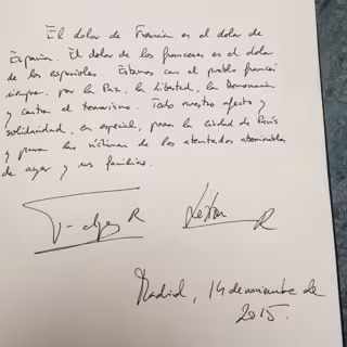 "El dolor de Francia es el dolor de España. El dolor de los franceses es el dolor de los españoles. Estamos con el pueblo francés, siempre por la paz, la libertad, la democracia y contra el terrorismo. Todo nuestro afecto y solidaridad , en especial, para la ciudad de París y para las víctimas de los atentados abominables de ayer y sus familias", dejó escrito el monarca en el mencionado libro.