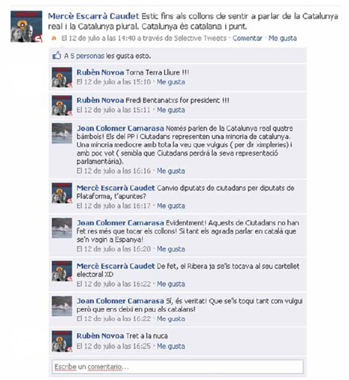 Novoa ha renunciado a presentarse a las primarias de la formación liderada por Laporta un día después de que trascendiera un comentario que había realizado en la red social Facebook, donde pedía un "tiro en la nuca" para Rivera.