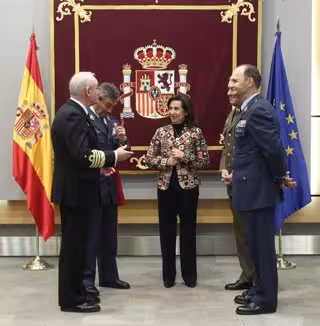 La ministra de Defensa, Margarita Robles (3i) y el general del Aire y nuevo jefe de Estado Mayor de la Defensa, Miguel Angel Villaroya (2i), junto a otros altos cargos del ejército, durante el acto de toma de posesión del cargo de Villaroya, en Madrid - Eduardo Parra - Europa Press
