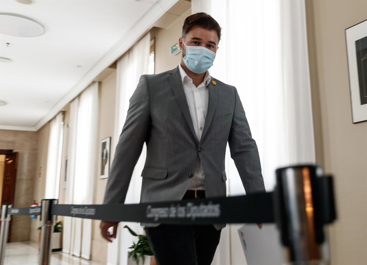 El portavoz de ERC en el Congreso de los Diputados, Gabriel Rufián, a su llegada a la rueda de prensa convocada antes de la reunión de la Junta de Portavoces, en Madrid (España), a 15 de septiembre de 2020. - Pool