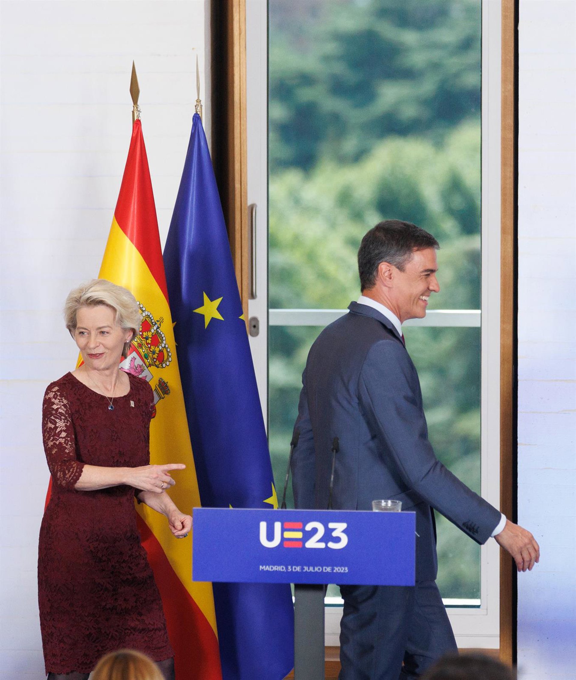 La presidenta de la Comisión Europea, Ursula von der Leyen y el presidente del Gobierno, Pedro Sánchez, a su llegada a una rueda de prensa posterior a la reunión plenaria del Gobierno de España y del Colegio de Comisarios, en la Galería de Colecciones R - Eduardo Parra - Europa Press