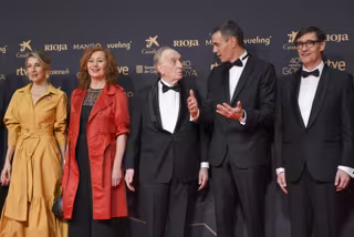 La vicepresidenta segunda, Yolanda Díaz; la presidenta del Congreso, Francina Armengol; el presidente de la Academia de Cine, Fernando Méndez-Leite; el presidente del Gobierno, Pedro Sánchez, y el presidente de la Generalitat, Salvador Illa, en los Goya. - Alberto Paredes - Europa Press