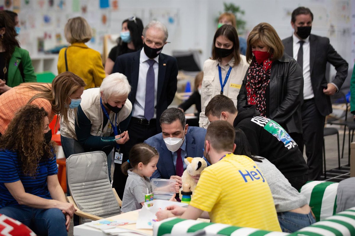 El presidente del Gobierno, Pedro Sánchez, en su visita al centro de refugiados ucranianos de Fira de Barcelona. - DAVID ZORRAKINO - EUROPA PRESS